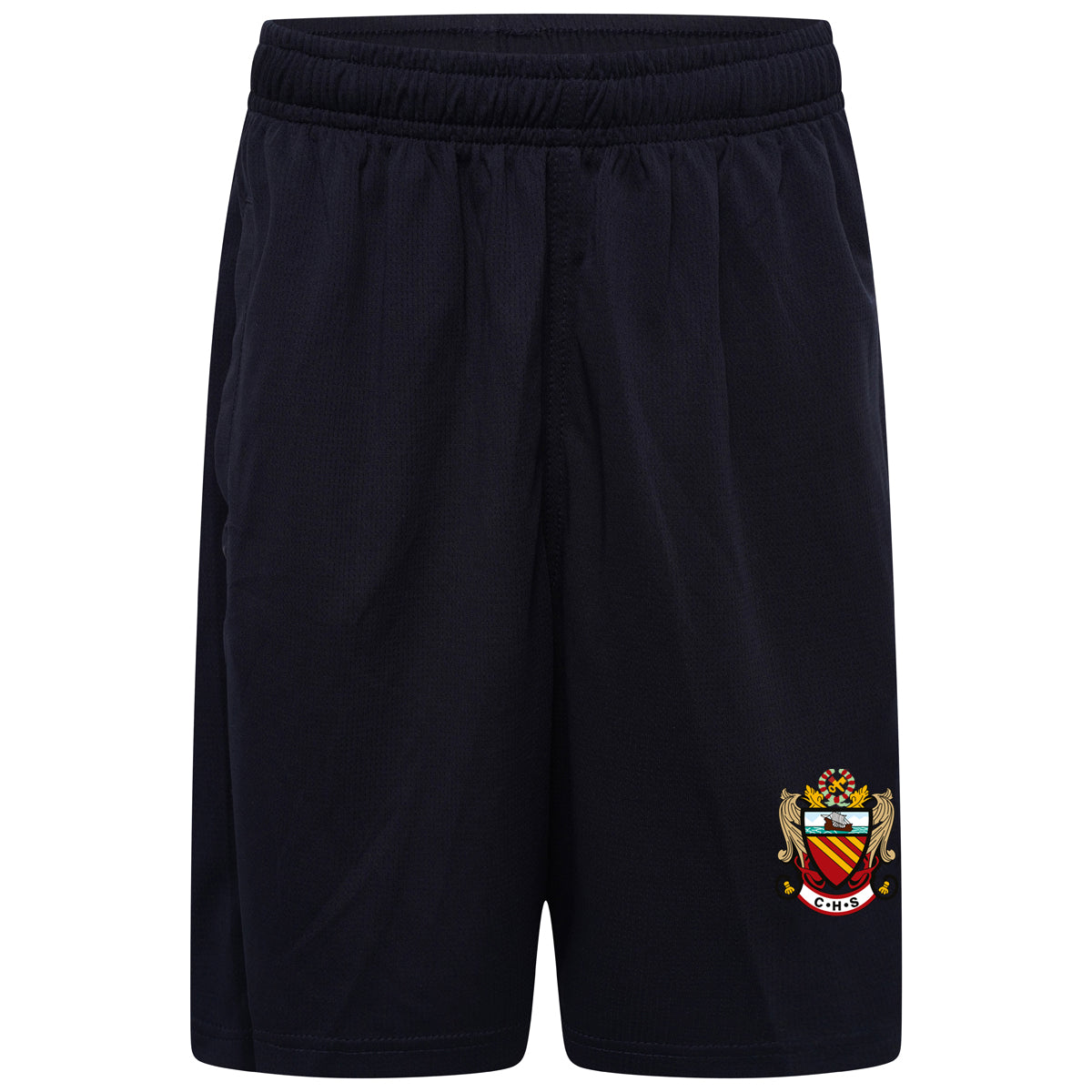 Cheadle Hulme School Sixth Form unisex navy performance shorts with logo.