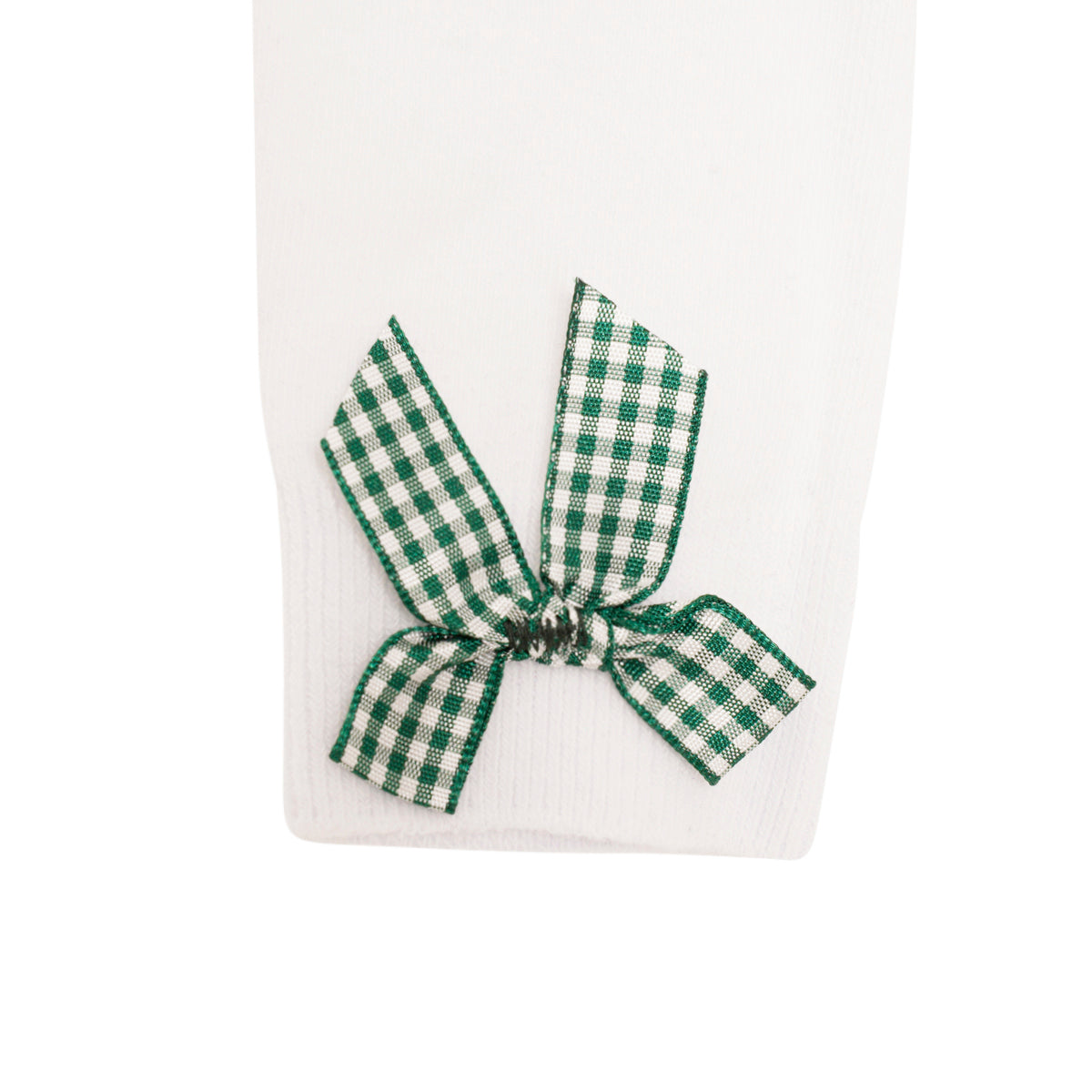 White socks with green gingham ribbon bow.